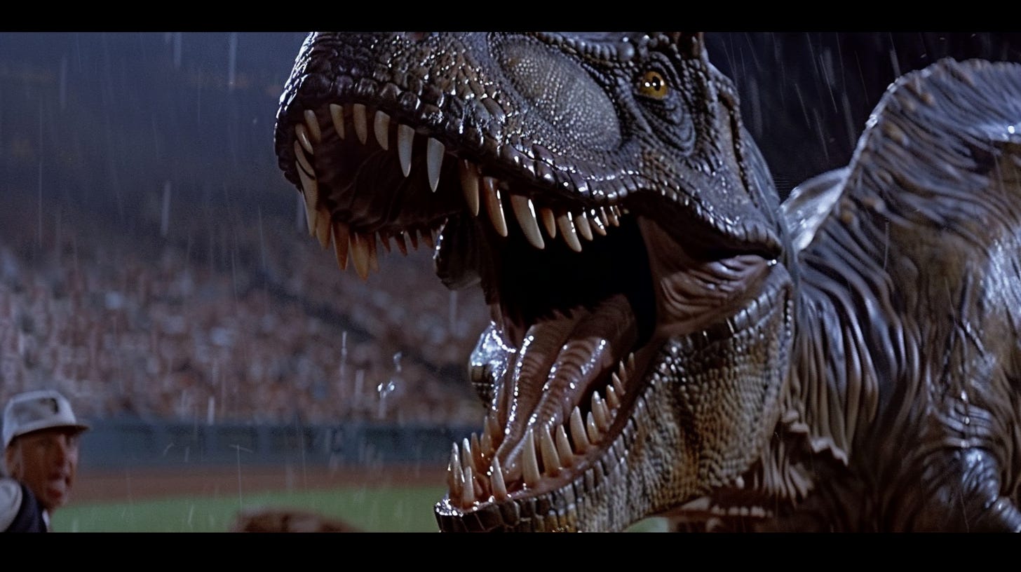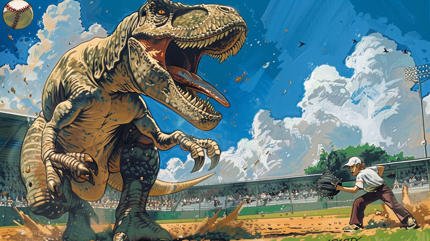 Suddenly, an odd sound pierces the jungle stillness—a strange, rhythmic cadence mingled with raucous cheering. The tyrannosaur's head snaps toward the noise, slit nostrils flaring. Through the dense foliage, an inexplicable vision shimmers into view—a vast, manicured field bordered by towering structures teeming with puny, hairless creatures. Figures in garish raiment scamper across the plain, wielding elongated sticks to bat a spherical object. The ball arcs through the air trailing a ghostly contrail, as the bizarre beings roar their approval.